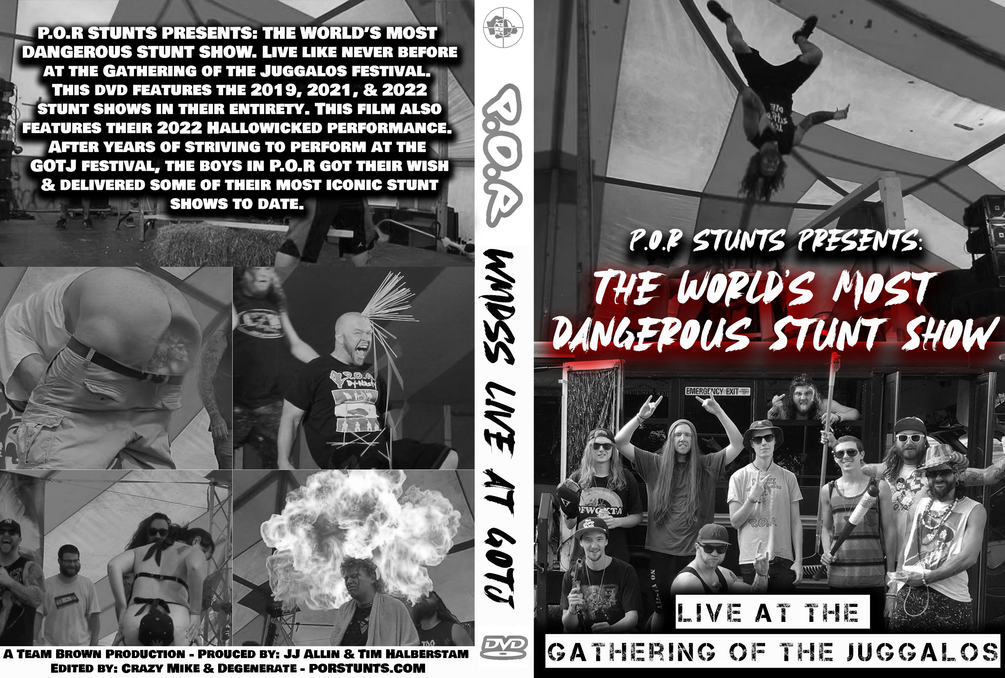 P.O.R Stunts presents: The World's Most Dangerous Stunt Show, live like never before at the Gathering of the Juggalos festival. This digital set includes the 2019, 2021, & 2022 stunt shows in their entirety. This set also includes their 2022 Hallowicked performance.